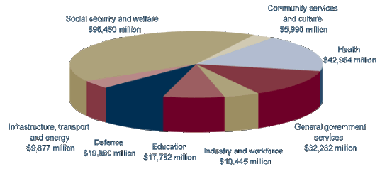 The big message baked into this pie is that Social Security ($96 billion) and Health ($42 billion) are the big uses of our money. If you try to break down the social security one, you’ll find it’s a big grab-bag of different payments. The dole is only about 5 percent of that. Pensions, Ausstudy, disability pensions, etc all add up to account for the rest.