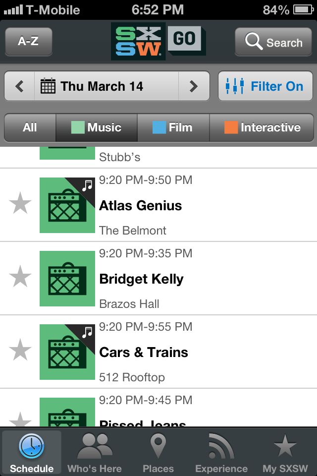 Even without checking the lanyards (technology: orange, music: green) you could tell what conference people were there for – the best signal was the cleanliness of their band t-shirts.