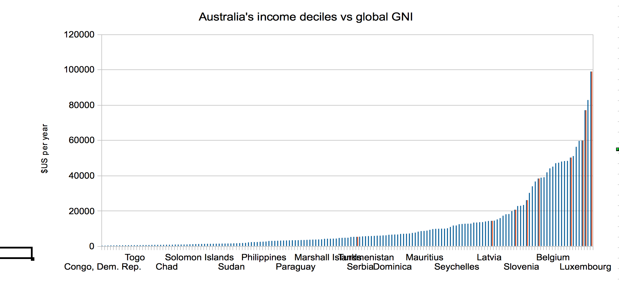 So, for perspective, here are Australia’s personal income levels – from the top of the poorest ten per cent to the bottom of the richest ten percent – compared to per capita GDP across the world. Perhaps we can picture material wealth better this way.