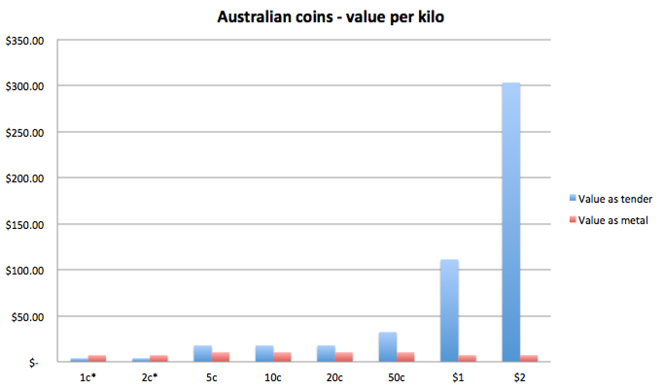 The Australian coin system is all wrong. The weight and bulk of our coins is disproportionately high, to the extent that some are worth over half as much as raw metal.