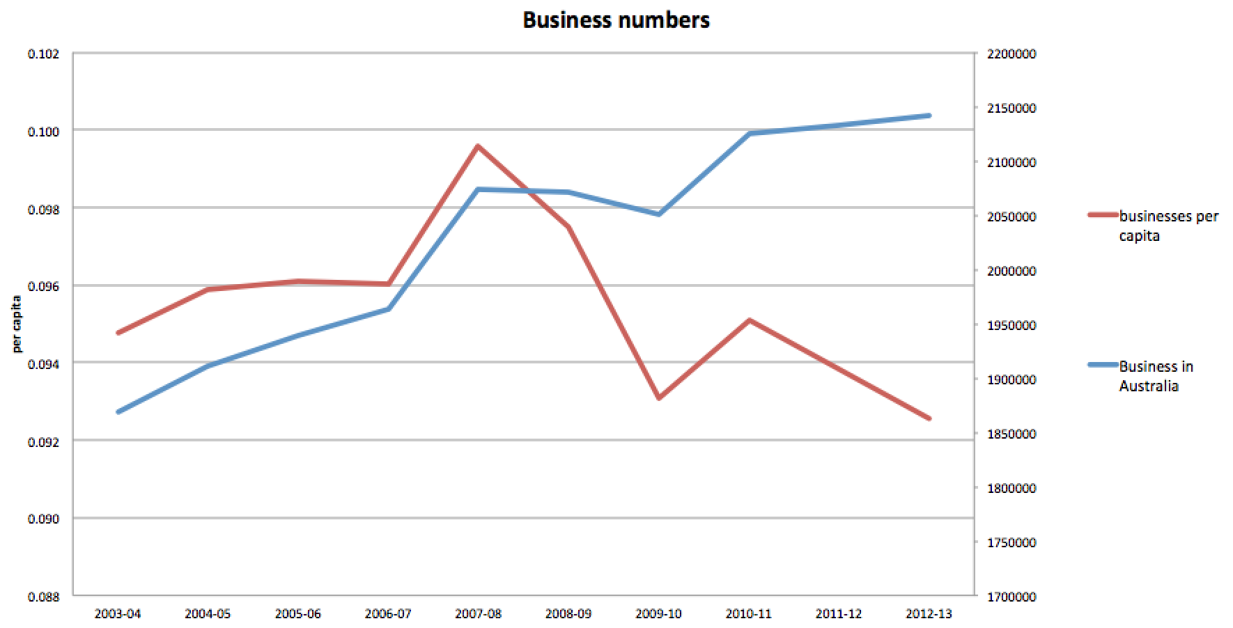 I’ve dived into the ABS figures to see what Australia looks like on the same issue. We don’t have as much historical data as America, but the numbers are just as striking. While Australia is home to ever more businesses, the number of businesses per person has fallen from nearly ten to closer to nine.