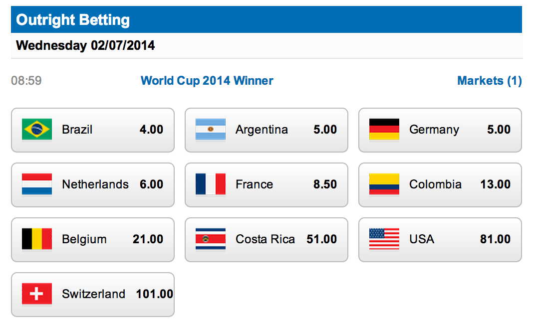 The availability heuristic probably means teams like Brazil are over-rated (the same to a lesser extent is likely true of recent World Cup finalists France, Germany and the Netherlands.) So should we let that affect our betting? Probably not.
