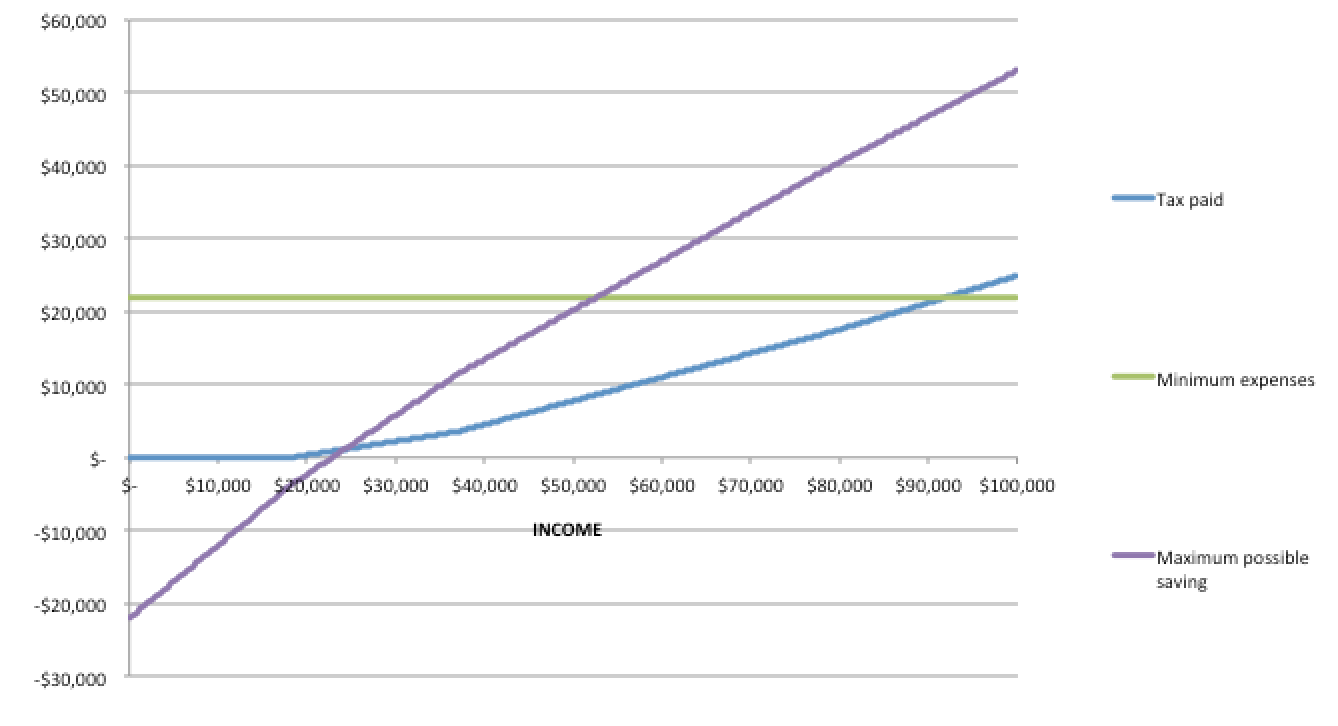 Before I made this graph, if you told me it was mathematically possible to save $20,000 a year on a pre-tax income of $50,000 I would have called you crazy. The graph above does not account for any government transfers or the low income tax offset (worth $230/year at income of $50k), either.