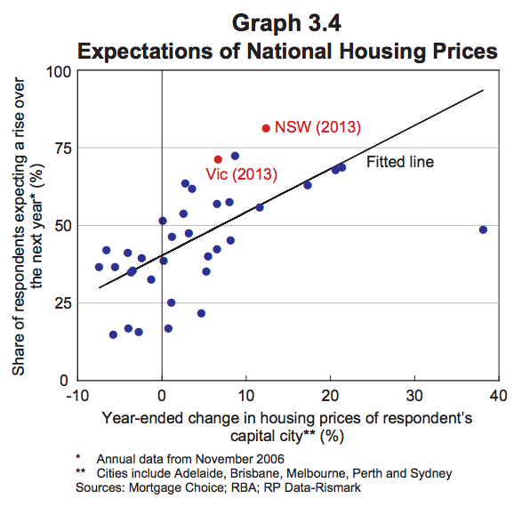 “… expectations of future housing prices seem to be influenced by the recent past (Graph 3.4). This tendency was stronger than average in New South Wales and Victoria at the end of last year. The risks associated with this behaviour are likely to be macroeconomic in nature if households were to react to declines in their wealth and any repayment difficulties by cutting back their spending. “
