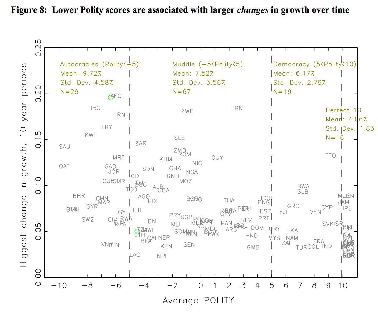 Pritchett does make one concession to analysing China itself, and that is to note that growth is, on average, less variable in countries that are more democratic.