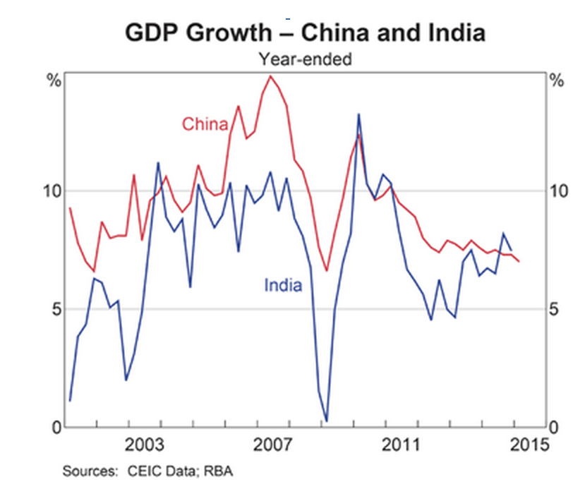 But I want to look at this from Australia’s perspective. Chinese growth has been essential to our economic health. The extra economic activity it added each year forced the Australian economy to expand too. But now its growth is shrinking. Will we see Indian growth take up the slack?