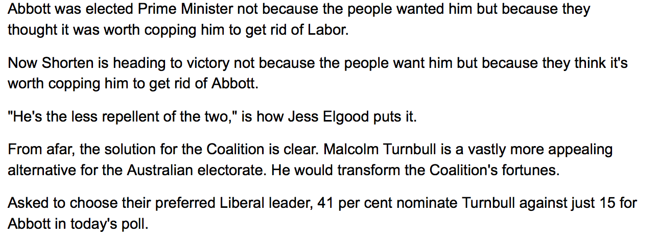 “Shorten is still leading the Labor party in the wake of this latest credibility disaster for the Coalition, after last week’s credibility disaster (blocking a free vote on marriage equality) and the preceding week’s credibility disaster (chopper-friendly Bronwyn Bishop). He’s now sitting atop polls from both Ipsos and Morgan that have the Coalition facing a loss of between 36 and 44 seats.