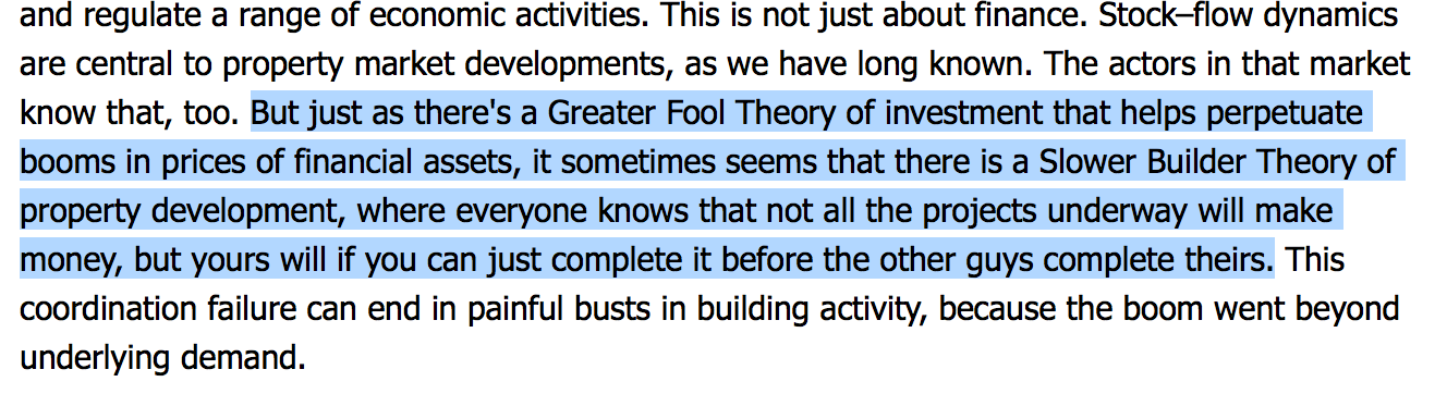 Building more houses in the inner city is hard, obviously, so they are building mostly apartments. The number of new apartment developments in Australia at the moment is a source of concern for our central bank. The head of financial stability singled out property developers for special attention just last week.