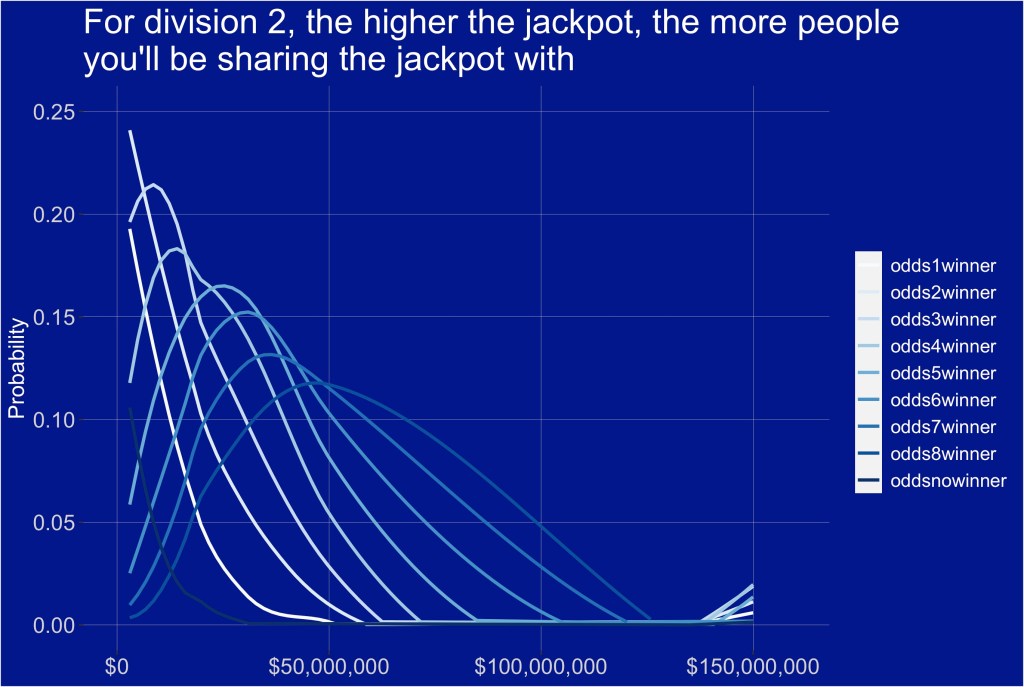 The same kind of result is seen for the other Divisions that require the Powerball (with the exception of Division One, because when there are fewer winners in Division One that usually means the number of winners goes to zero and the prize goes down to zero too.)