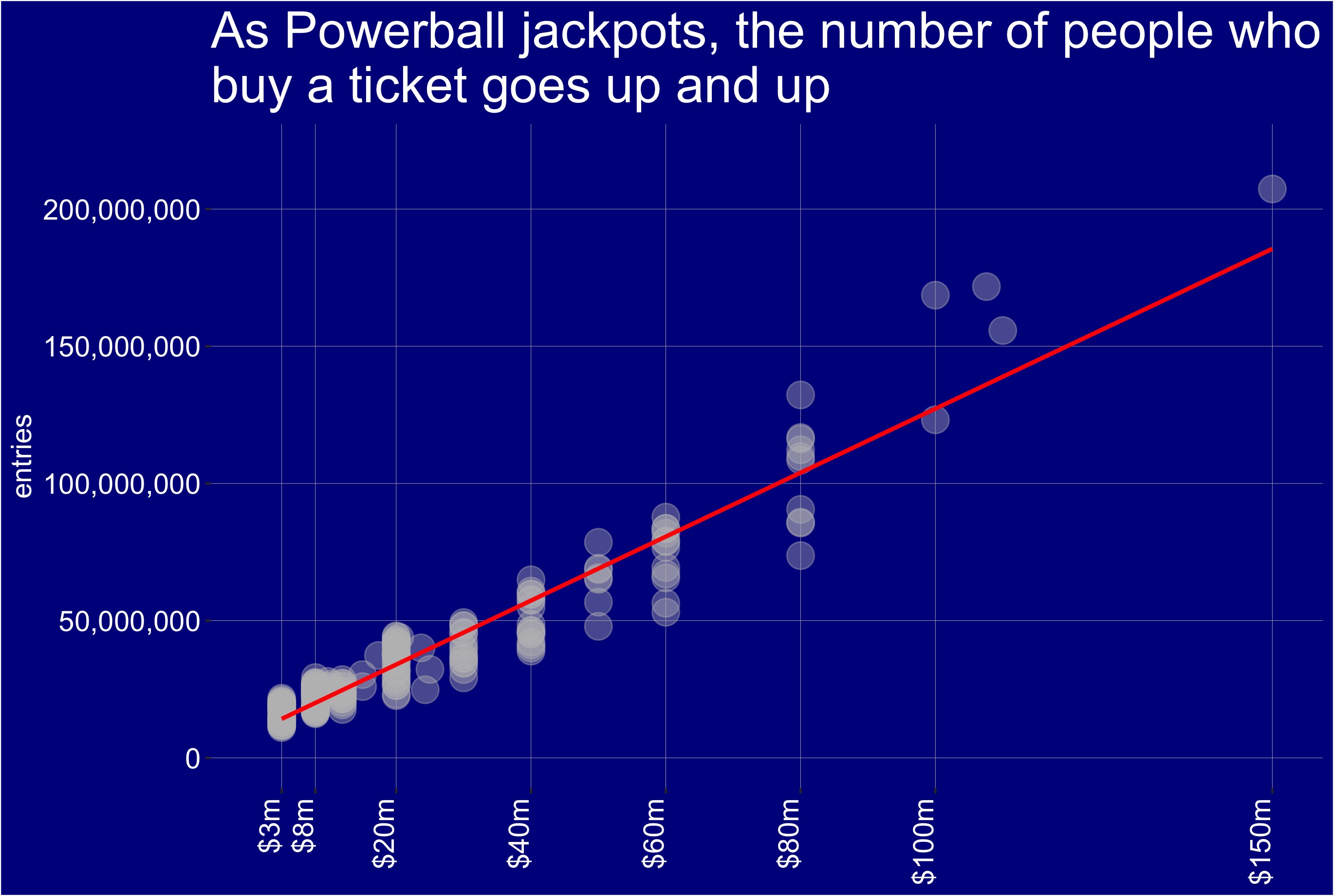 I published my post on Tuesday and the draw was on Thursday night. It might have been a popular post but it had absolutely zero effect in dissuading ticket sales! In fact, Powerball managed to sell more tickets for last Thursday’s draw than they had ever sold for any draw before. I had a model that said they would sell 175 million tickets. Instead they sold 250 million tickets. The next graph shows how far out of the usual pattern it was.