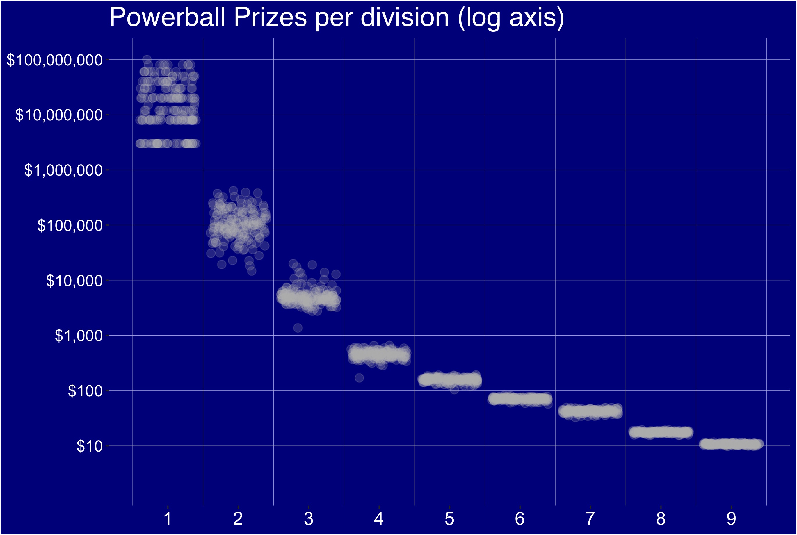 Divisions 2, 4 and 7 don’t require the Powerball to win. They provide our baseline. On any given week, if there are many winners in Divisions that don’t need the Powerball to win, but few winners in the Divisions that do need the Powerball, that might be a signal that the Powerball drawn that week was not a popular choice for players. And vice-versa.