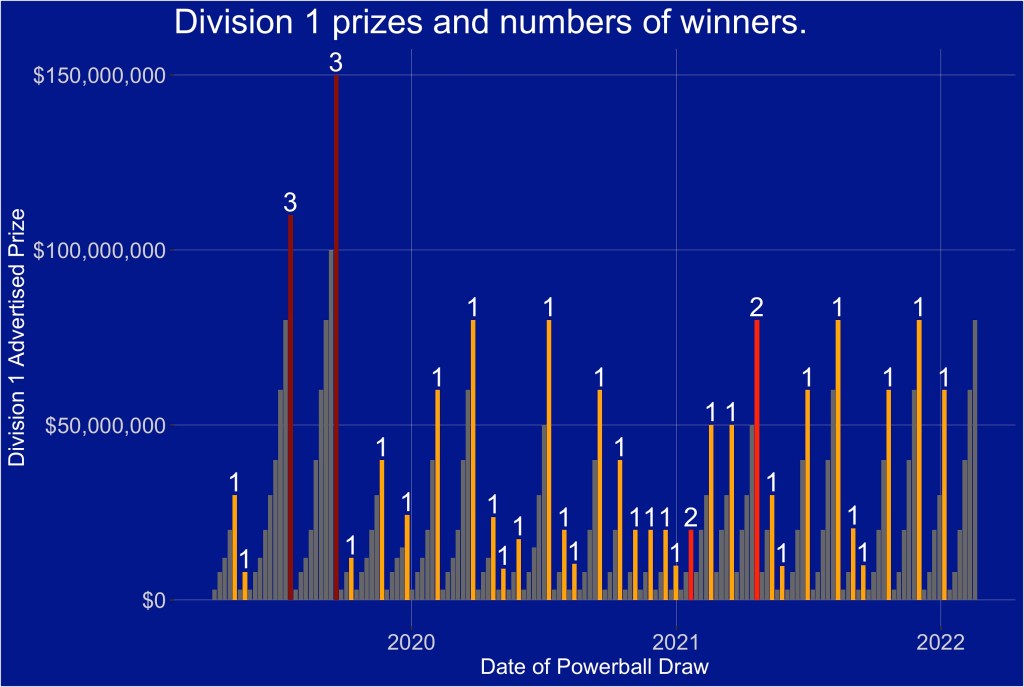 I got the above numbers by maths. The real-world test is if they are associated with higher prizes. So I checked to see if the bottom three least popular numbers were associated with bigger wins.