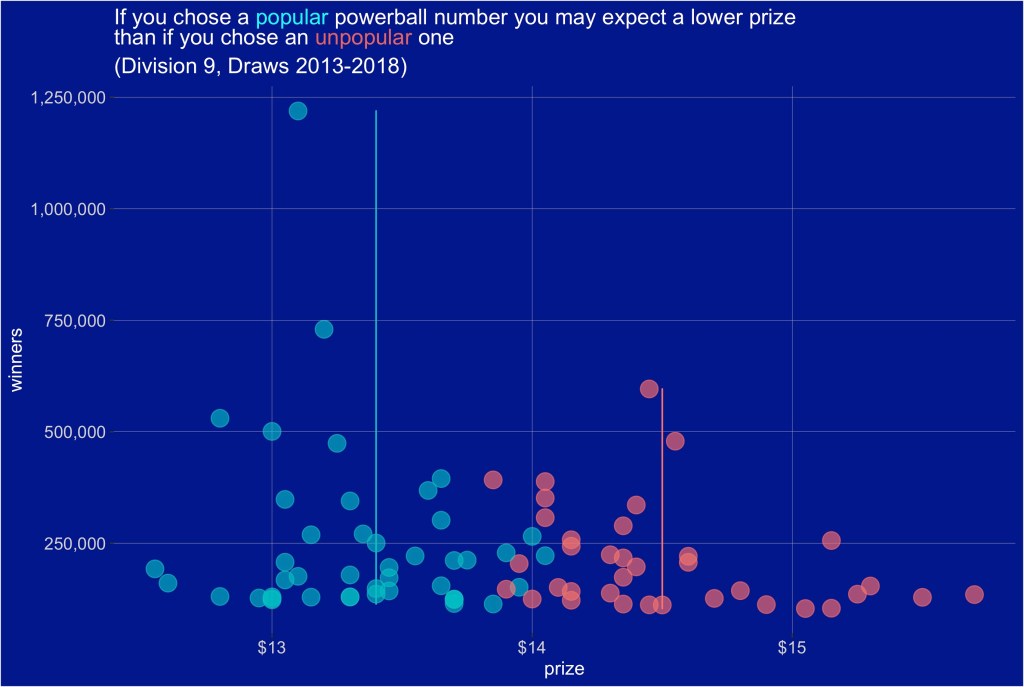 I’m intrigued by the way the most popular four numbers are close to the middle of the range 1 to 20. It’s like people are using an understandable but silly heuristic – trying to minimise the size of their miss. They choose a number close to the middle. That way whether the Powerball is 5 or 15, they can say, Oooh, Close. (But not right in the middle, that doesn’t seem random enough! 10 is not popular.)