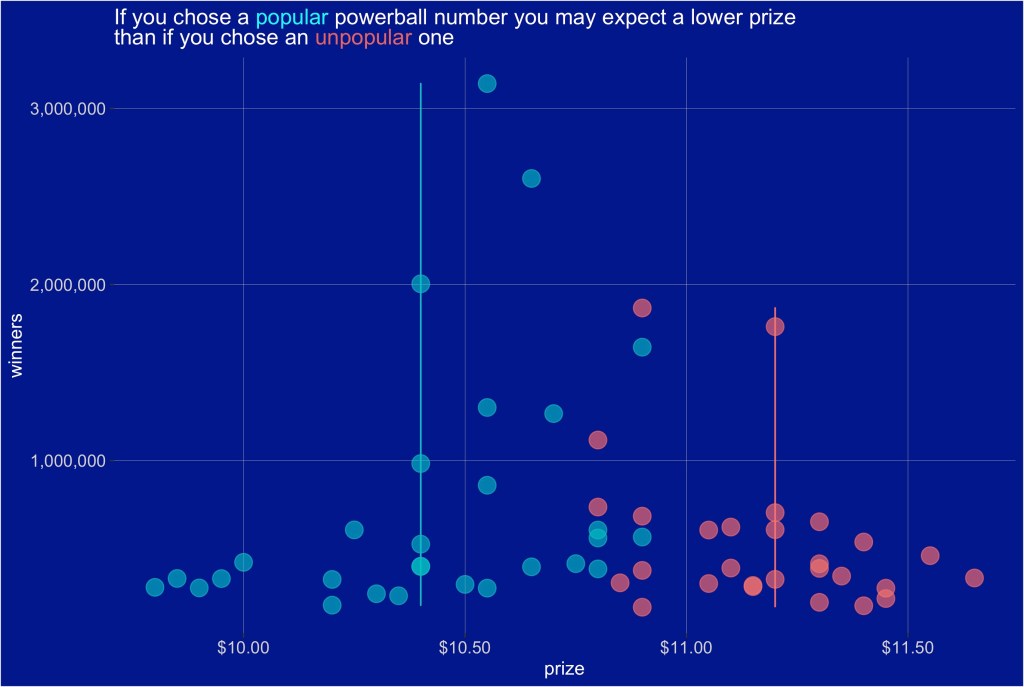 It’s also surprising to see 13 relatively popular and 8 lower down. This result makes me think people are actually already trying to use a version of this strategy – choosing unpopular numbers and avoiding popular ones. But absent data, Powerball players are all crowding into the same idea and negating its value!