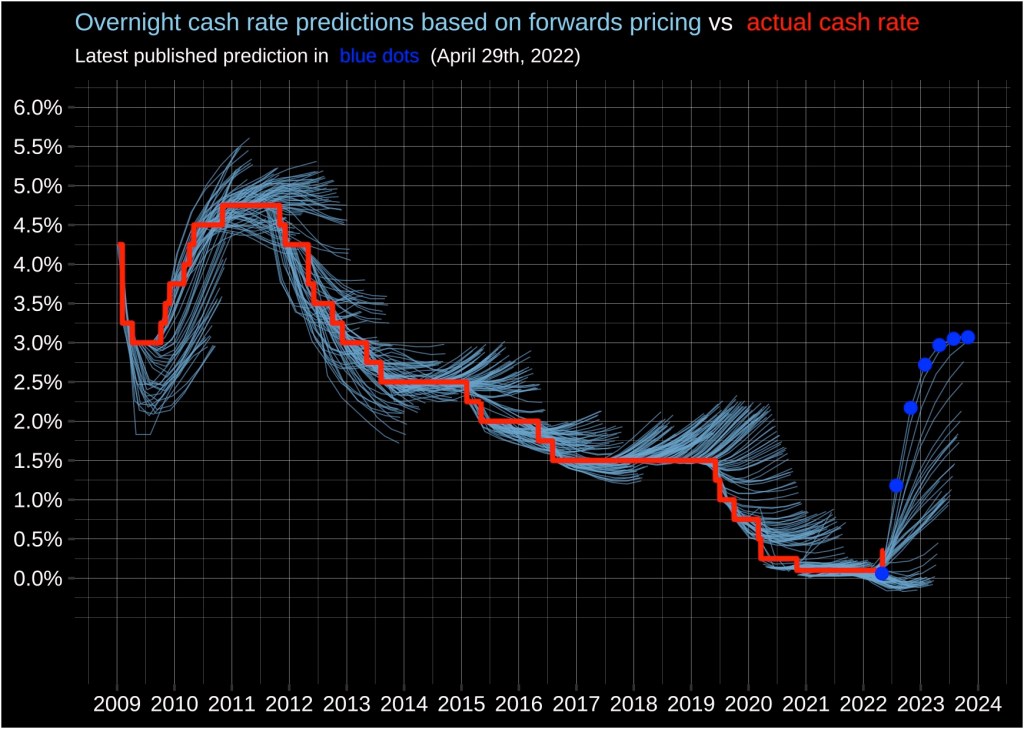 The chart is not one person’s prediction. Instead it uses the wisdom of crowds: the values are derived from market prices in the Interbank Cash Rate Futures market. This market has a very good recent history of prediction. Back in 2021, It was insisting rate rises were coming in 2022 when the RBA was insisting the opposite and reassuring us they wouldn’t arrive until 2023-2024. But how accurate are these predictions more generally? Where do they come from? What assumptions do they make? I did some digging.