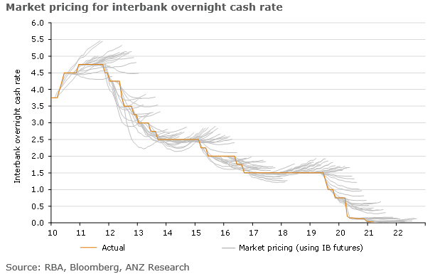 The big question: Does this market really give us the best guess of the cash rate? This chart, from ANZ, seems to show the interbank futures generating a systemic overestimate of the eventual cash rate. There is much more grey line above the orange line than below, especially for the predictions made about later months in each forecast (each grey line is 17 or 18 months long and they almost all seem to bend back up). Is that for some technical reason? Or just because in the 12-year period depicted nobody could quite believe interest rates would not turn around and “normalise”?