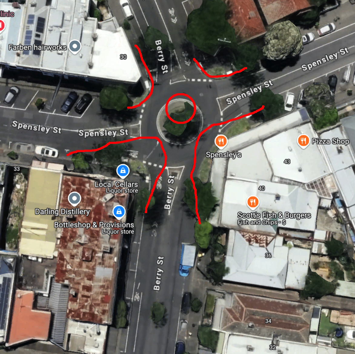 There’s another roundabout I would like to point out as well where this principle could help inspire better land use. It’s much smaller and in a less idyllic setting, but it is a crowded pedestrian area with very small footpaths. There’s a cafe there with outside tables that would benefit from much more footpath space. The site on the other side was a pub and could become an even more succesful one if there was space for a few outside tables.