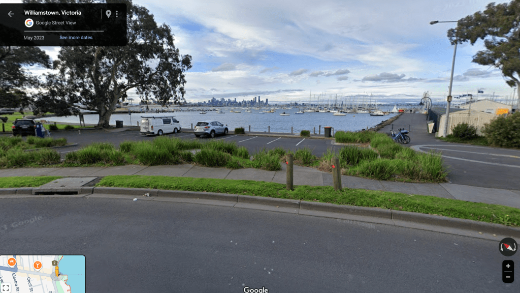 Here’s how I imagine the solution looking in Willliamstown. The new roads are outlined in red. The land in the roundabout is connected to the park. You could put in a micro roundabout at the new intersection or a stop sign. The road to the south side is just a driveway into the yacht club so it won’t be too busy (the busier the road the further you’d need to be from it to enjoy your surroundings)